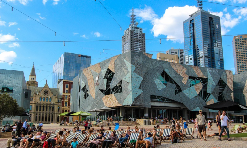 The Federation Square is a mixed-use development in the inner city of Melbourne, Australia. Its disconcerted design is made worse by the web of wires which hang above the structures.