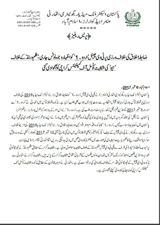 پیمرا نے نجی چینل کو 12ستمبر 2017 کو پیمرا کمیٹی کے سامنے پیش ہوکر اپنا مؤقف دینے کا حکم دیا ہے۔عدم پیروی کی صورت میں یکطرفہ کارروائی عمل میں لائی جائے گی۔
