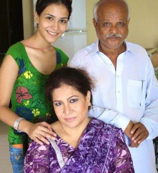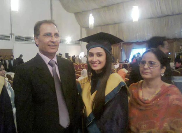 عائزہ خان اپنے والد اور والدہ کے ساتھ کھڑی ہوئی ہیں ۔