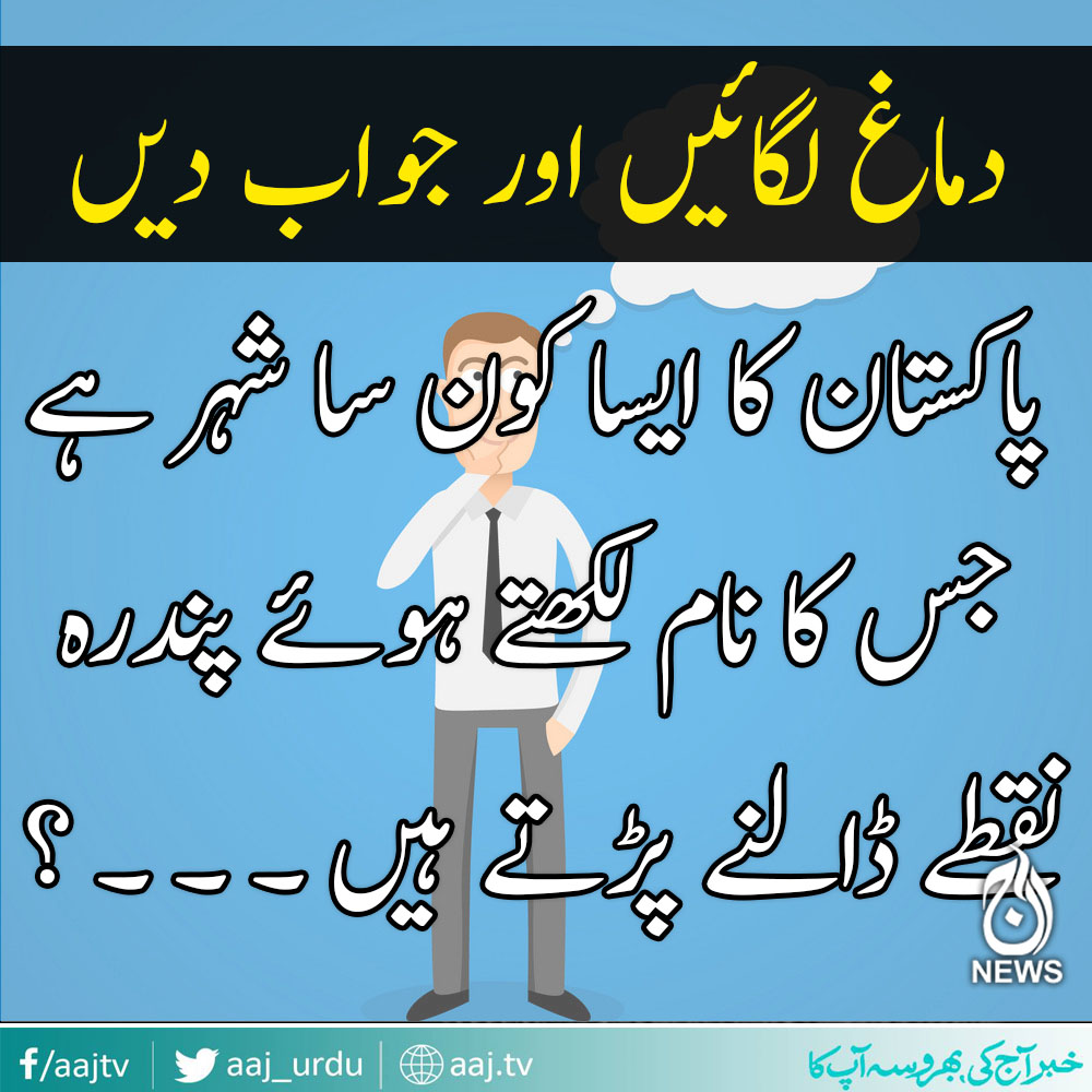 سوچ کر جواب دیجیئے ۔ ۔ ۔ ؟ ھمیر رانا اپ ڈیٹ 12 ستمبر 2018 02:55pm ویڈیوز - انفوٹینمینٹ Join our Whatsapp Channel پاکستان کا وہ کونسا شہر ہے جس کا نام لکھتے ہوئے پندرہ نقطے ڈالنے پڑتے ہیں ۔ ۔ ۔ وہ شہر پاک پتن شریف ہے ۔ Facebook Twitter Whatsapp Comments اس کہانی پر تبصرے بند ہیں۔ تبصرے تبولا Taboola ads will show in this div مزید خبریں Iran to Close Strait of Hormuz | Trump Warning Fallout | Global Oil Crisis Risk - 12AM Headlines Strait of Hormuz Crisis | Iran Shocks USA | Middle East Tensions - 11PM Headlines Eid 2026 | Connecting Youth with Literature | Education & Culture Initiatives | Pakistan - Aaj News Eid ulFitr 2026 | Arts Council Achievements | Pakistan Cultural Milestones | Arts & Events- Aaj News Eid 2026 | Eid Celebrations | Art, Culture & Tradition | Pakistan Festivities - Aaj Pakistan News Eid special program 2026 - Eid 2nd day - Dus with Imran Sultan - Aaj News مقبول ترین موٹر سائیکل مالکان کو ماہانہ 2000 روپے کس طرح ملیں گے، طریقہ جانیے ایران اچانک دھڑا دھڑ امریکی طیارے کیسے گرا رہا ہے؟ امریکی حکام کی ایران میں لڑاکا طیارے کی تباہی کی تصدیق، صدر ٹرمپ کو بھی آگاہ کر دیا موٹر سائیکل مالکان کو ماہانہ 2000 روپے کس طرح ملیں گے، طریقہ جانیے ایران اچانک دھڑا دھڑ امریکی طیارے کیسے گرا رہا ہے؟ امریکی حکام کی ایران میں لڑاکا طیارے کی تباہی کی تصدیق، صدر ٹرمپ کو بھی آگاہ کر دیا تازہ ترین ’ایران کے پاس 48 گھنٹے ہیں، ڈیل نہ کی تو قیامت ٹوٹ پڑے گی‘، ٹرمپ کی دھمکی دفترِ خارجہ نے یو اے ای کے مالی ذخائر سے متعلق تبصرے مسترد کر دیے ایران نے عراق کو آبنائے ہرمز پر عائد پابندیوں سے مستثنیٰ قرار دے دیا