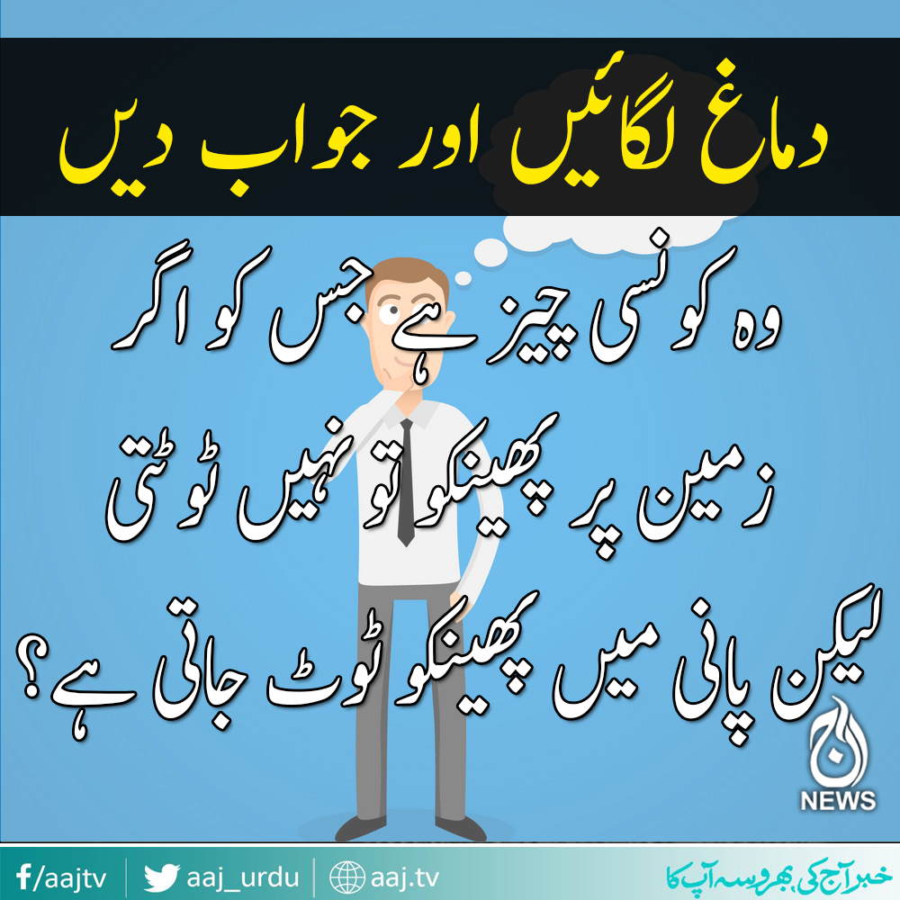 سوچ کر جواب دیجیئے ۔ ۔ ۔ ؟ ھمیر رانا اپ ڈیٹ 13 ستمبر 2018 04:21pm ویڈیوز - انفوٹینمینٹ Join our Whatsapp Channel وہ کونسی چیز ہے جسکو زمین پر پھینکو تو ٹوٹتی لیکن پانی میں پھینکو تو ٹوٹ جاتی ہے ۔ ۔ ۔ ۔ وہ چیز آپکا سایہ ہے کیونکہ پانی میں سایہ ٹوٹ جاتا ہے لیکن زمین پر نہیں ٹوٹتا۔ Facebook Twitter Whatsapp Comments اس کہانی پر تبصرے بند ہیں۔ تبصرے تبولا Taboola ads will show in this div مزید خبریں Iran to Close Strait of Hormuz | Trump Warning Fallout | Global Oil Crisis Risk - 12AM Headlines Strait of Hormuz Crisis | Iran Shocks USA | Middle East Tensions - 11PM Headlines Eid 2026 | Connecting Youth with Literature | Education & Culture Initiatives | Pakistan - Aaj News Eid ulFitr 2026 | Arts Council Achievements | Pakistan Cultural Milestones | Arts & Events- Aaj News Eid 2026 | Eid Celebrations | Art, Culture & Tradition | Pakistan Festivities - Aaj Pakistan News Eid special program 2026 - Eid 2nd day - Dus with Imran Sultan - Aaj News مقبول ترین جنگ یا جنگ بندی میں توسیع: 22 اپریل کے بعد کیا ہوگا؟ موت سے قبل کیسے خواب نظر آتے ہیں؟ سائنسی تحقیق میں دلچسپ انکشاف ’امریکا تیار، ایران کا انکار‘: اسلام آباد میں مذاکرات کے دوسرے مرحلے کی تیاریاں جاری جنگ یا جنگ بندی میں توسیع: 22 اپریل کے بعد کیا ہوگا؟ موت سے قبل کیسے خواب نظر آتے ہیں؟ سائنسی تحقیق میں دلچسپ انکشاف ’امریکا تیار، ایران کا انکار‘: اسلام آباد میں مذاکرات کے دوسرے مرحلے کی تیاریاں جاری تازہ ترین ایران کا امریکا کے ساتھ مذاکرات سے انکار، ٹرمپ کی فیلڈ مارشل کو ہرمز ناکہ بندی پر نظرثانی کی یقین دہانی ایرانی وفد امریکا سے مذاکرات کے لیے اسلام آباد نہ آیا تو کیا ہوگا؟ امریکی نیوی کا ایرانی بحری جہاز پر میزائل حملہ، مذاکرات پر سوال اُٹھ گئے