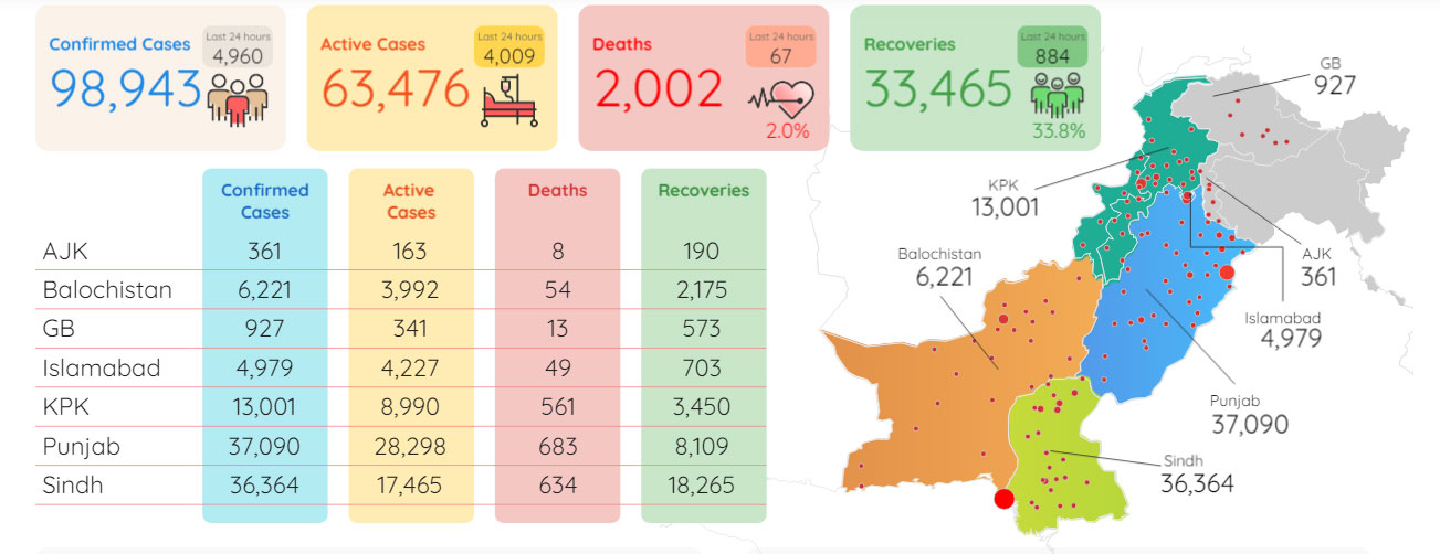 ملک بھر میں گزشہ 24گھنٹےکےدوران مزید 4ہزار960نئے کیسز رپورٹ ہوئےجس کے بعد پاکستان میں کوروناکےمریضوں کی تعداد98ہزار943ہوگئی۔