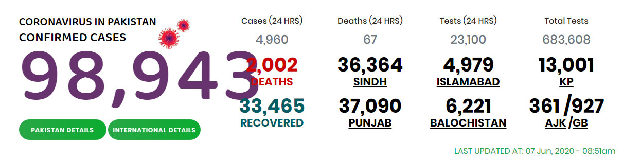 پاکستان میں مزید 716 افراد کورونا وائرس کا شکار،تعداد98ہزار943 ہوگئی