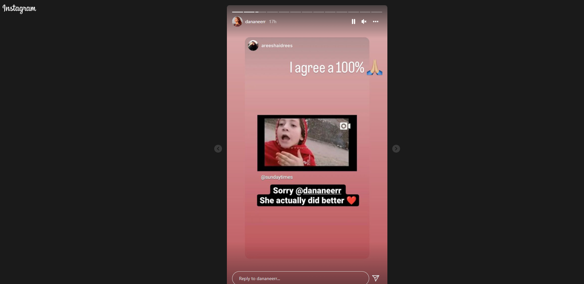 اس کے ساتھ دنانیر مبین انسٹا گرام اسٹوری میں کہا کہ اس بچی نے یہ ویڈیو ان سے زیادہ اچھی طرح سے بنائی ہے۔