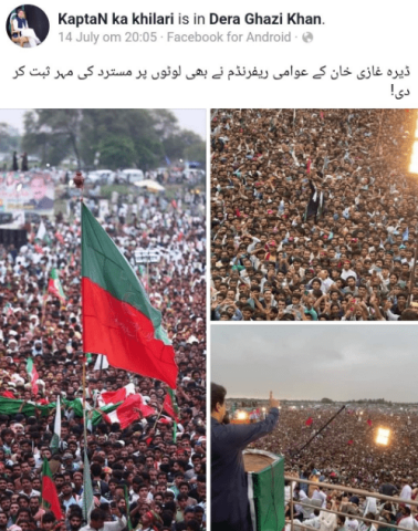 اور شاید خود پی ٹی آئی کا آفیشل ٹوئٹراکاؤنٹ ہینڈل کرنے والوں نے یہ تصویر اپنے ہی ایک حامی اکاؤنٹ سے لی تھی، کپتان کا کھلاڑی نامی اس فیس بک اکاؤنٹ سے یہ تصویر 14 جولائی کو شیئرکی گئی تھی۔