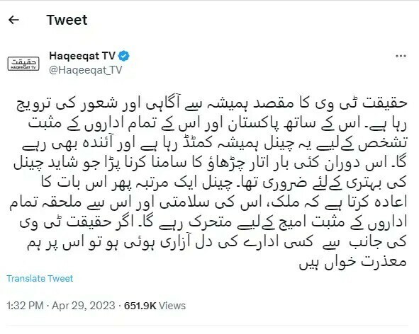 اچانک ہی حقیقت ٹی وی کے آفیشل ٹوئٹر اکاؤنٹ سے 29 اپریل کو ”ادارے“ سے معافی مانگی گئی اور ملکی سلامتی کے اداروں کا مثبت تشخص پیش کرنے کا اعادہ کیا گیا۔