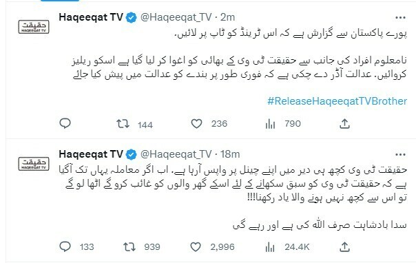 ساتھ ہی اس کیلئے ہیش ٹیگ ReleaseHaqeeqatTVBrother بھی درج کیا گیا۔