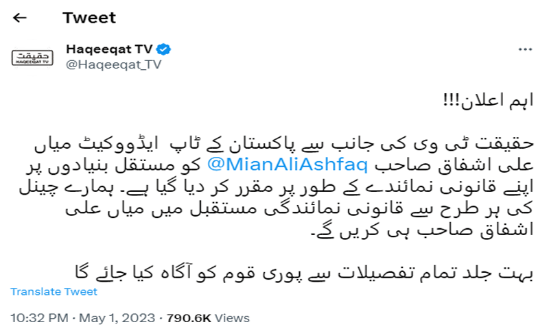 اس کے بعد یکم مئی کو ایک اور پیغام جاری ہوا جس میں کہا گیا کہ ’ حقیقت ٹی وی کی جانب سے پاکستان کے ٹاپ ایڈووکیٹ میاں علی اشفاق صاحب کو مستقل بنیادوں پر اپنے قانونی نمائندے کے طور پر مقرر کر دیا گیا ہے۔ ہمارے چینل کی ہر طرح سے قانونی نمائندگی مستقبل میں میاں علی اشفاق صاحب ہی کریں گے۔’