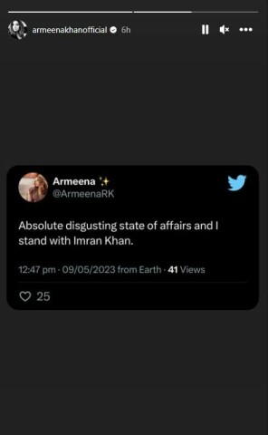 اداکارہ ارمینا رانا خان نے کہا کہ جو ہورہا ہے وہ بہت قابل نفرت ہے اور میں عمران خان کے ساتھ کھڑی ہوں۔