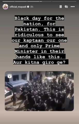 اداکارہ مایا علی نے عمران خان کی گرفتاری کو پاکستان کا سیاہ دن قرار دیا اور لکھا کہ ہمارے کپتان اور واحد وزیراعظم کو ایسے گرفتار کیا گیا اور کتنا گرو گے؟