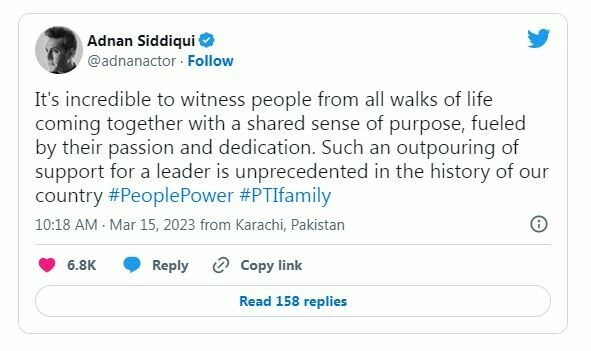 اداکار عدنان صدیقی نے لکھا کہ ایک سابق وزیر اعظم کو کسی مجرم کی طرح گھسیٹنا شرمناک عمل ہے جس سے سخت صدمہ ہوا۔ 72 سال میں کبھی ایسا نہیں ہوا کہ ایک سابق وزیر اعظم کو یوں گرفتار کیا جائے۔