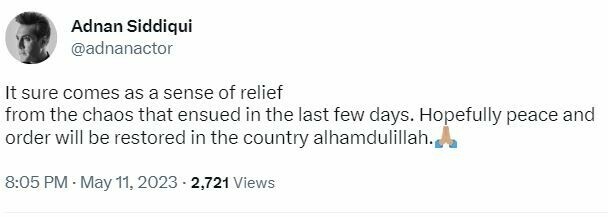 اداکار عدنان صدیقی نے ٹوئٹ کرتے ہوئے لکھا کہ امید ہے اب ملک میں امن و امان بحال ہوجائے گا ۔