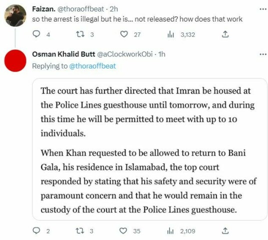 اداکار عثمان خالد بٹ نے بھی ایک فرد کو جواب دیتے ہوئے سمجھایا کہ عدالت نے عمران خان کو رہائی کا حکم تو دیا ہے، تاہم ان کی حفاظت کے پیش نظر انہیں عدالتی نگرانی میں پولیس گیسٹ ہاؤس میں رکھنے کا حکم دیا گیا ہے۔