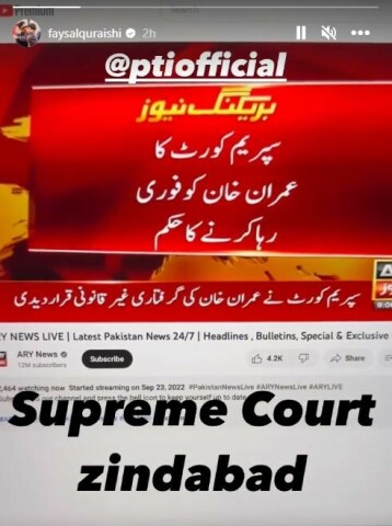 اداکار فیصل قریشی نے بھی عمران خان کی رہائی کے حکم پر خوشی کا اظہار کرتے ہوئے سپریم کورٹ زندہ باد لکھا۔