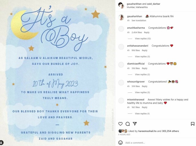 انہوں نے انسٹاگرام پر اعلان کرتے ہوئے کہا کہ ’لڑکا ہوا ہے، ہماری خوشی کا محور آپ سب کو السلام علیکم کہتا ہے‘۔