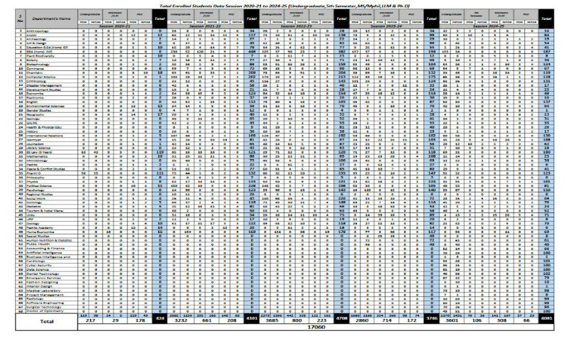 زیادہ تر شعبوں میں ایم فل اور پی ایچ ڈی کے پروگرامز طلبہ سے خالی پڑے ہیں۔ شعبہ کمپیوٹر سائنس میں 2020 سے صرف ایک طالب علم زیر تعلیم ہے، جب کہ ڈیٹا سائنس، سافٹ ویئر انجینئرنگ، آرٹیفیشل انٹیلیجنس، فیشن ڈیزائننگ اور انٹیریئر ڈیزائن جیسے جدید شعبوں میں گزشتہ پانچ سال سے کوئی طالب علم ڈاکٹریٹ کی ڈگری حاصل نہ کر سکا۔