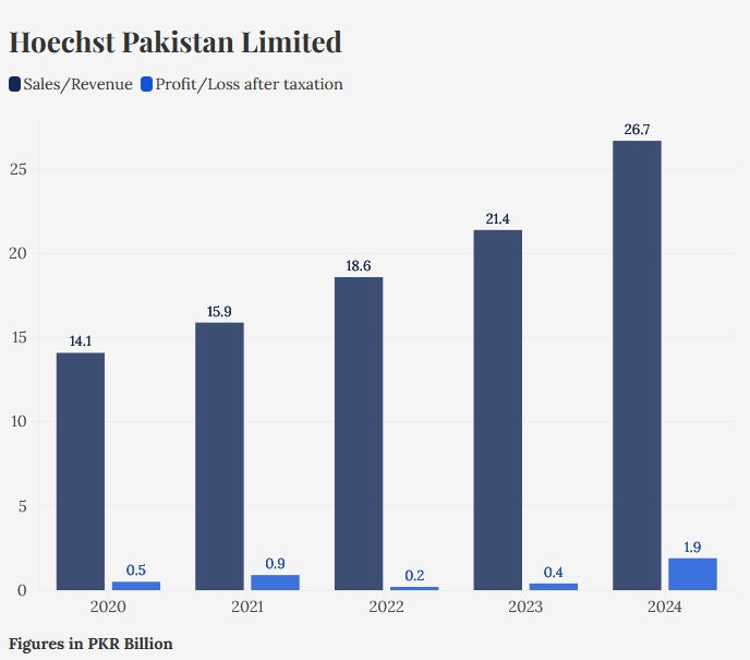 1977 میں پی ایس ایکس میں شامل ہونے والی کمپنی نے وقت کے ساتھ کئی انضمام اور نام کی تبدیلیاں دیکھی ہیں، اور اب یہ ہوخسٹ پاکستان لمیٹڈ کے نام سے جانی جاتی ہے۔ 2023 میں پیکیجز گروپ اور دیگر شراکت داروں نے کمپنی کے 52.87 فیصد حصص خریدے۔ کمپنی جلد متحدہ عرب امارات میں ذیلی ادارہ قائم کرنے جا رہی ہے۔