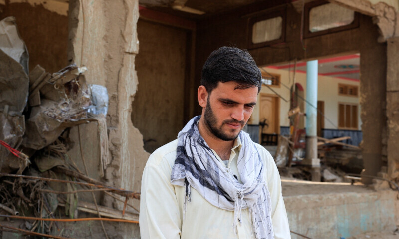 نور محمد جن کی عمر 25 سال ہے، سیلاب کے باعث تباہ شدہ اپنے خاندان کے 36 کمروں والے گھر کے ملبے کے پاس کھڑے تھے، جو قادر نگر گاؤں میں ایک سیلابی نالے کے کنارے واقع تھا۔