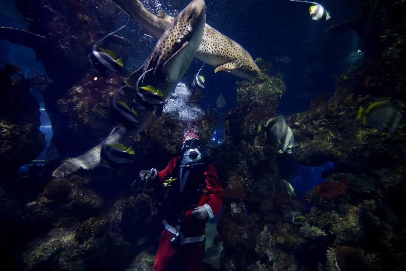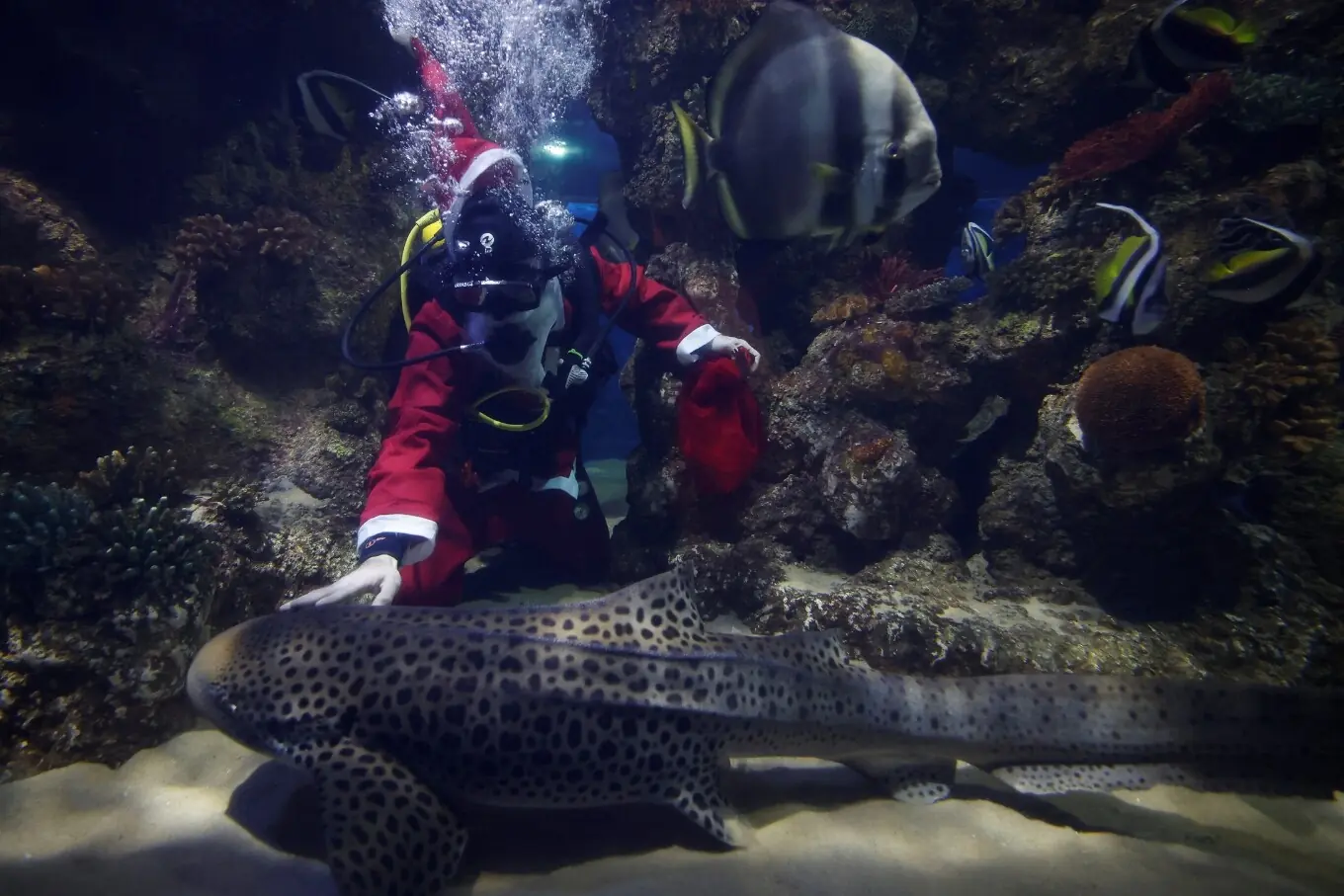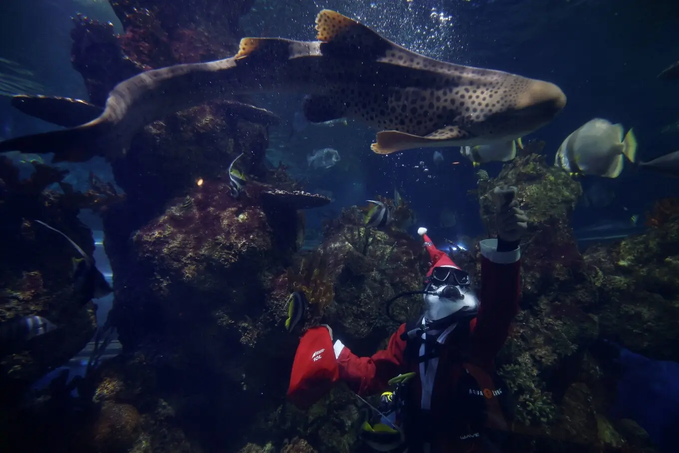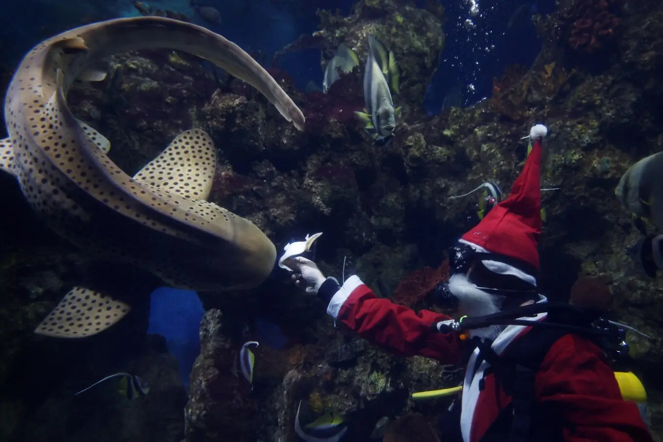 مالٹا کے ساحلی شہر کوورا میں نیشنل ایکویریم میں کرسمس سے قبل ایک دلچسپ نظارہ دیکھنے کو ملا، جہاں سانتا کلاز کے لباس میں ملبوس ڈائیور نے ٹینک کے اندر موجود زیبرا شارک اور مچھلیوں کو خوراک دی۔ کرسمس سیزن کے موقع پر یہاں خصوصی سرگرمیوں کا اہتمام کیا جاتا ہے، جن کا مقصد آنے والے مہمانوں کو تفریح اور انوکھا تجربہ فراہم کرنا ہے۔ اس منفرد مظاہرے کو دیکھنے کے لیے بڑی تعداد میں لوگ موجود تھے جو منظر کو کیمروں میں قید کرتے رہے۔