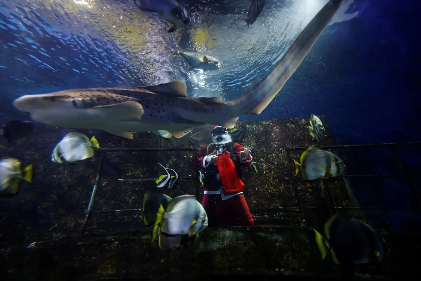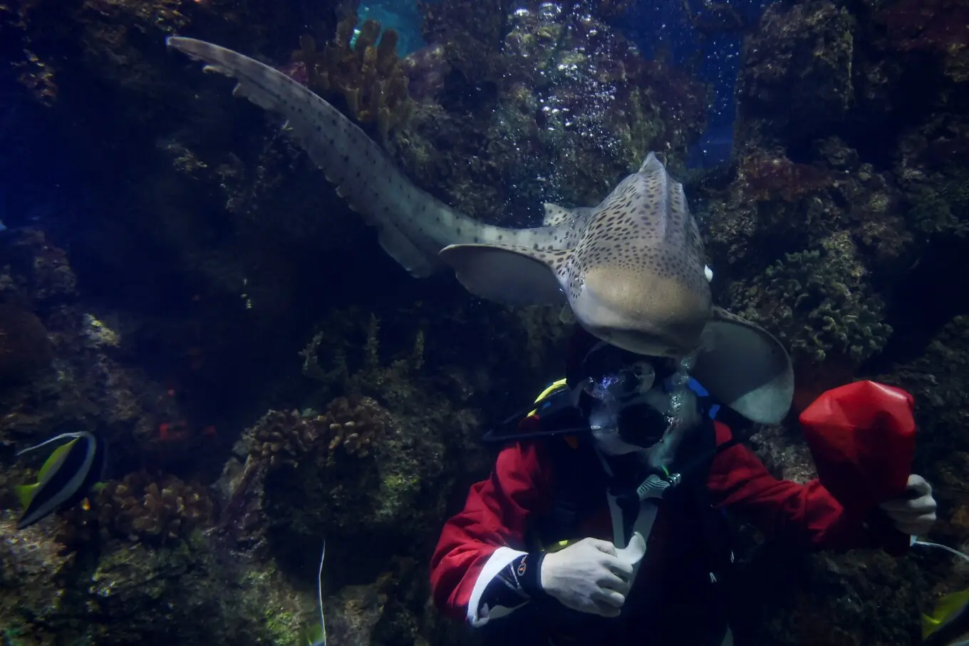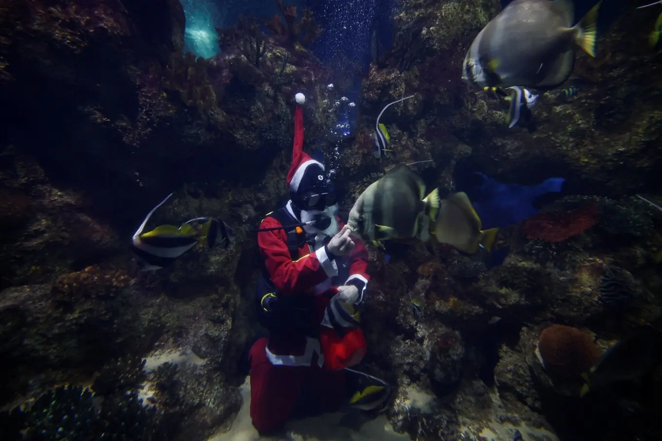 مالٹا کے ساحلی شہر کوورا میں نیشنل ایکویریم میں کرسمس سے قبل ایک دلچسپ نظارہ دیکھنے کو ملا، جہاں سانتا کلاز کے لباس میں ملبوس ڈائیور نے ٹینک کے اندر موجود زیبرا شارک اور مچھلیوں کو خوراک دی۔ کرسمس سیزن کے موقع پر یہاں خصوصی سرگرمیوں کا اہتمام کیا جاتا ہے، جن کا مقصد آنے والے مہمانوں کو تفریح اور انوکھا تجربہ فراہم کرنا ہے۔ اس منفرد مظاہرے کو دیکھنے کے لیے بڑی تعداد میں لوگ موجود تھے جو منظر کو کیمروں میں قید کرتے رہے۔
