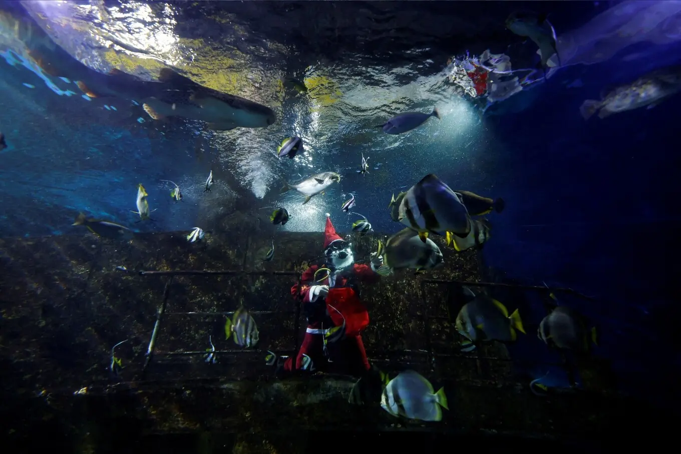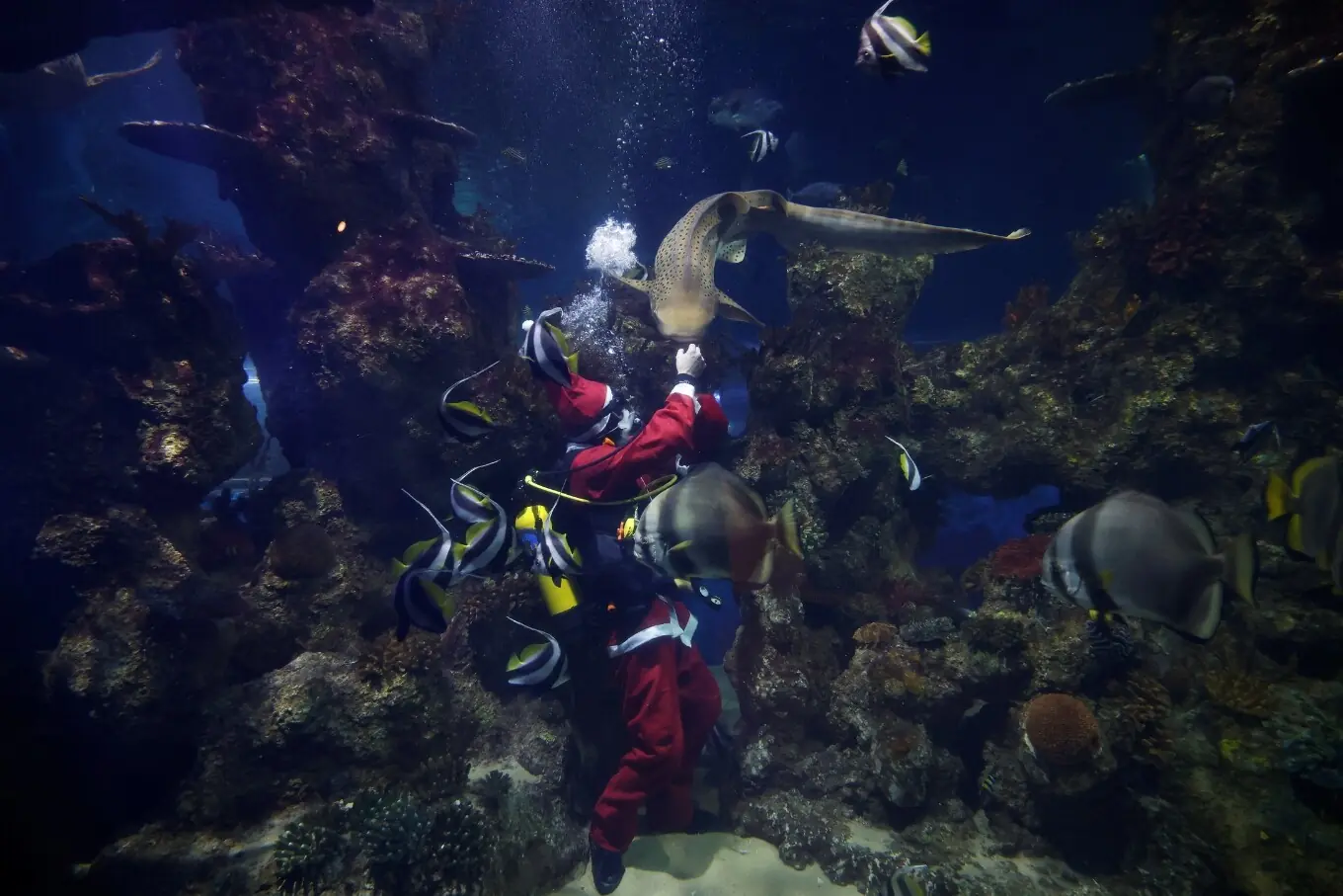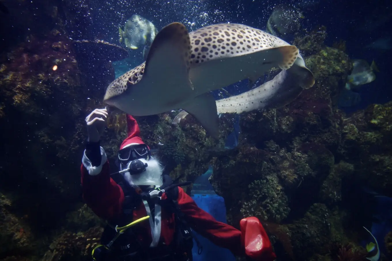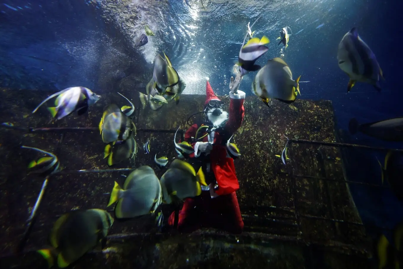 مالٹا کے ساحلی شہر کوورا میں نیشنل ایکویریم میں کرسمس سے قبل ایک دلچسپ نظارہ دیکھنے کو ملا، جہاں سانتا کلاز کے لباس میں ملبوس ڈائیور نے ٹینک کے اندر موجود زیبرا شارک اور مچھلیوں کو خوراک دی۔ کرسمس سیزن کے موقع پر یہاں خصوصی سرگرمیوں کا اہتمام کیا جاتا ہے، جن کا مقصد آنے والے مہمانوں کو تفریح اور انوکھا تجربہ فراہم کرنا ہے۔ اس منفرد مظاہرے کو دیکھنے کے لیے بڑی تعداد میں لوگ موجود تھے جو منظر کو کیمروں میں قید کرتے رہے۔