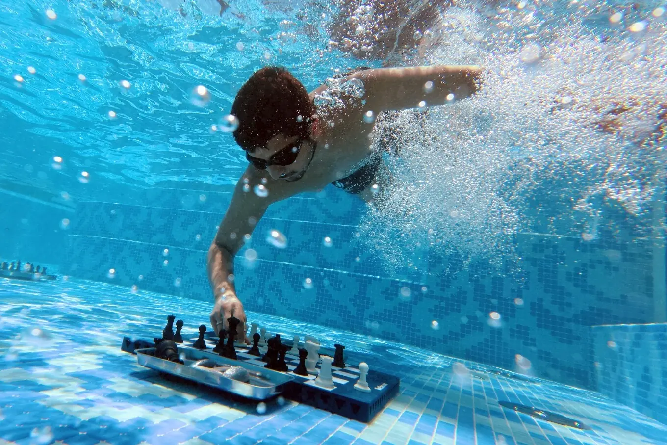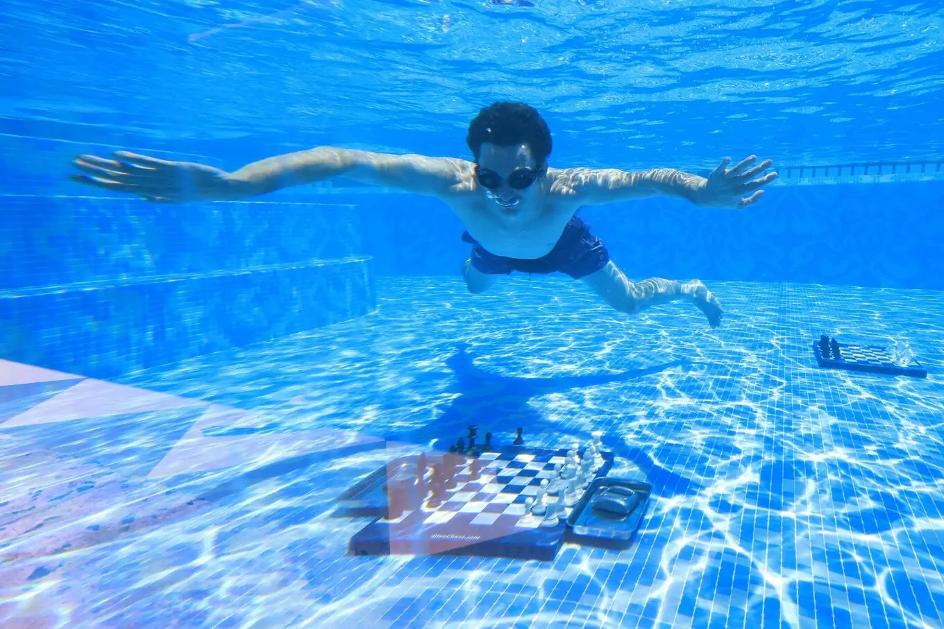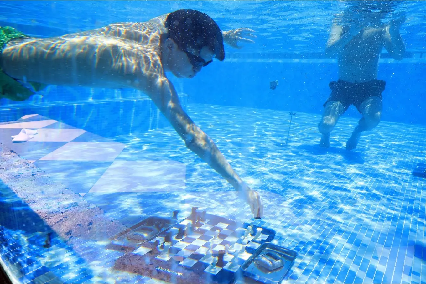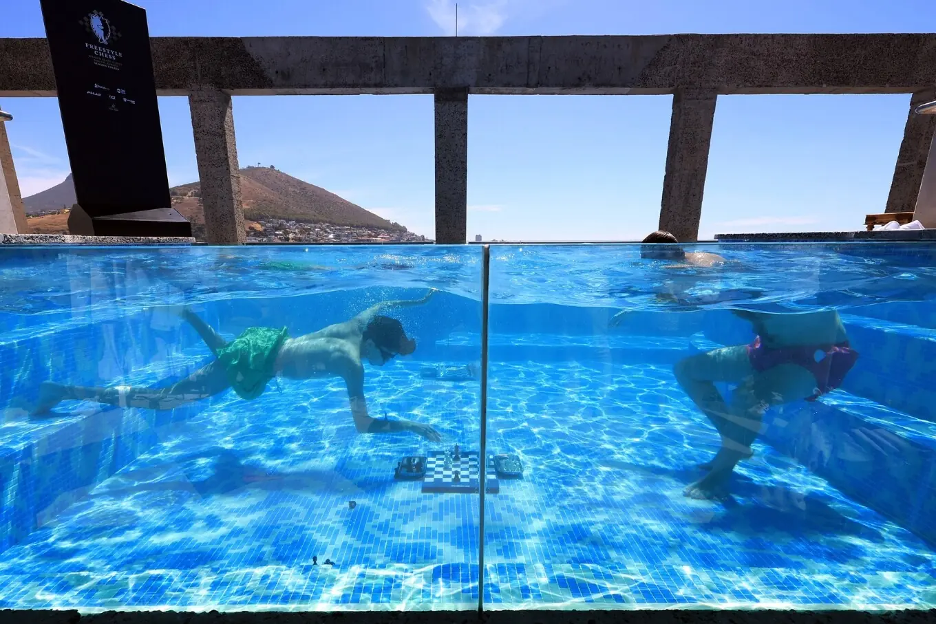 جنوبی افریقا کے شہر کیپ ٹاؤن کے سائلَو ہوٹل میں منعقدہ منفرد ڈائیونگ چیس مقابلے میں شطرنج کے گرینڈ ماسٹرز نے پانی کے اندر اپنی مہارت کے جوہر دکھائے۔ امریکی کھلاڑی ہانس نیمان اور فیبیانو کاروآنا نے پریکٹس سیشن کے دوران نہ صرف ذہنی چیلنج بلکہ پانی کے دباؤ کے ساتھ بھی مقابلہ کیا، جس نے اس ایونٹ کو روایتی چیس سے بالکل مختلف اور دلچسپ بنا دیا۔