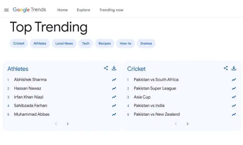 پاکستان میں کرکٹ سے متعلق سب سے زیادہ سرچ کیے جانے والے موضوعات میں بھی حیران کن رجحان سامنے آیا ہے، جہاں ’پاکستان بمقابلہ جنوبی افریقا‘ نے پاکستان سپر لیگ اور ایشیا کپ کو بھی پیچھے چھوڑ دیا۔