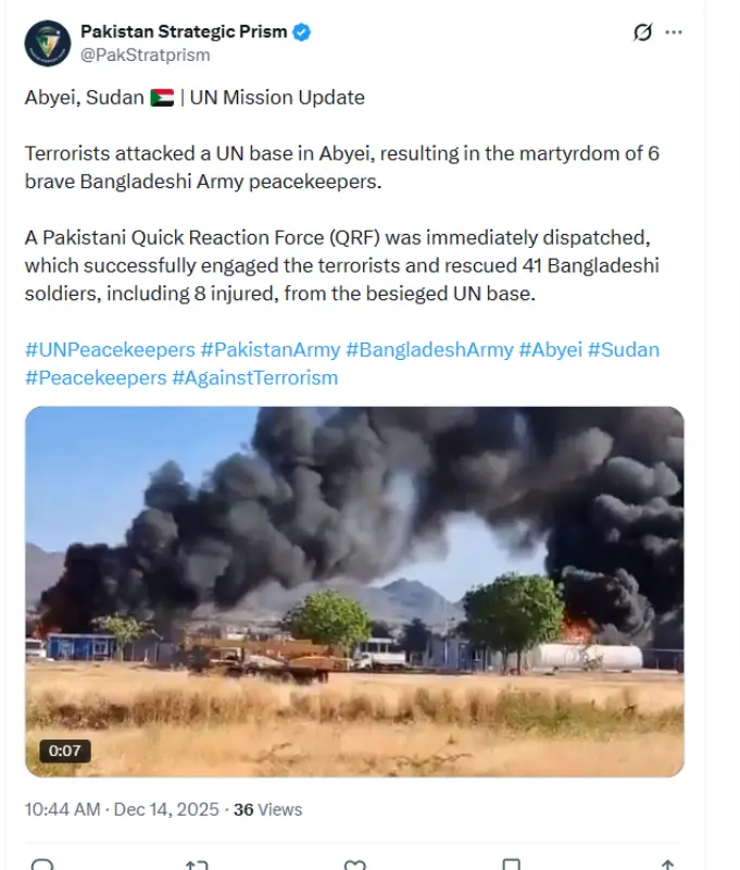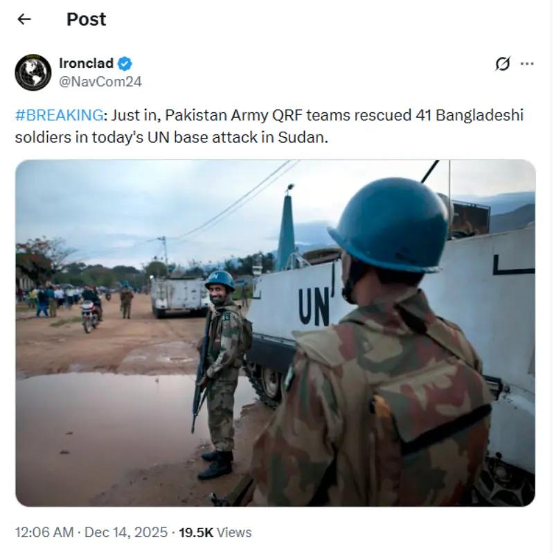 ‘بی ڈی ملٹری اکاؤنٹ’ نے اپنی پوسٹ کے کیپشن میں لکھا کہ “سوڈان میں بنگلہ دیشی اقوامِ متحدہ کے امن دستوں پر ہونے والے خوفناک حملے کے بعد سوشل میڈیا پر بعض رپورٹس گردش کر رہی ہیں جن میں دعویٰ کیا جا رہا ہے کہ پاکستانی کوئیک ری ایکشن فورس (کیو آر ایف) کو تعینات کیا گیا جنہوں نے 41 بنگلہ دیشی فوجیوں کو ریسکیو کیا اور حملہ آوروں سے مقابلہ کیا۔”