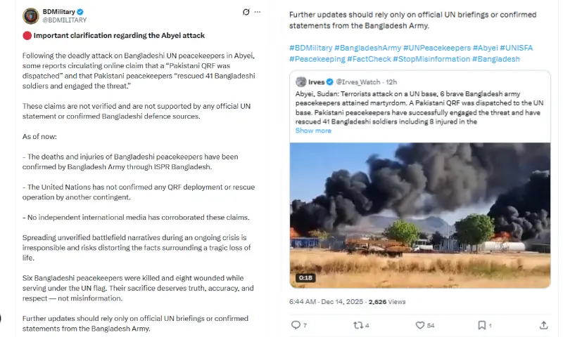 پوسٹ کے مطابق “یہ دعوے تاحال غیر مصدقہ ہیں اور نہ تو اقوامِ متحدہ کے کسی سرکاری بیان سے ان کی تصدیق ہوتی ہے اور نہ ہی بنگلہ دیش کے مستند دفاعی ذرائع نے ان کی توثیق کی ہے۔”