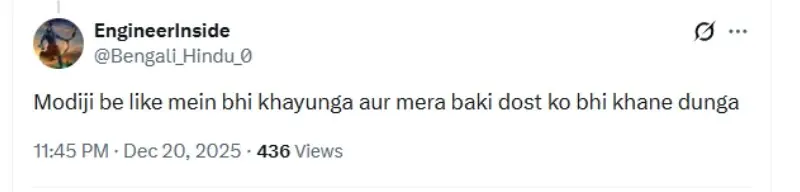 ایک صارف نے اپنی پوسٹ میں بھارتی وزیر اعظم نریندر مودی کو ہی نشانہ بناتے ہوئے لکھا کہ، ”مودی جی بی لائیک: میں بھی کھاؤں گا اور میرے باقی دوستوں کو بھی کھانے دوں گا۔“