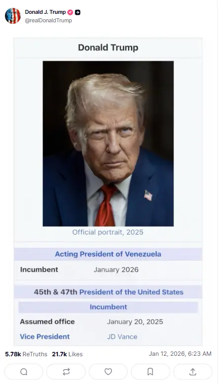 ٹرمپ نے اپنے سوشل میڈیا پلیٹ فارم ’ٹروتھ سوشل‘ پر ایک تصویر پوسٹ کی ہے، جس میں انہوں نے خود کو جنوری 2026 سے وینزویلا کا عبوری صدر لکھا ہے۔