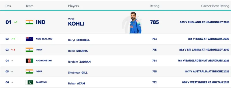 پاکستان کے سابق کپتان بابراعظم کی ون ڈے رینکنگ میں چھٹی پوزیشن بر قرار ہے۔ اس کے علاوہ بھارتی بیٹر کے ایل راہل نے بھی ایک درجہ بہتری حاصل کی ہے، وہ 21 گیندوں پر 29 ناٹ آؤٹ رنز بنانے کے بعد 12ویں سے 11ویں نمبر پر آ گئے ہیں۔