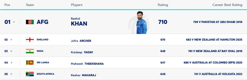 ون ڈے بولرز کی ٹاپ 10 فہرست میں کوئی تبدیلی نہیں ہوئی، افغانستان کے راشد خان کی پہلی پوزیشن برقرار ہے اورانگلینڈ کے جوفرا آرچر دوسرے جب کہ بھارت کے کلدیپ یادیو تیسرے نمبر پر موجود ہیں۔ پاکستان کے ابرار احمد نویں اور حارث رؤف بائیسویں پوزیشن پر موجود ہیں۔