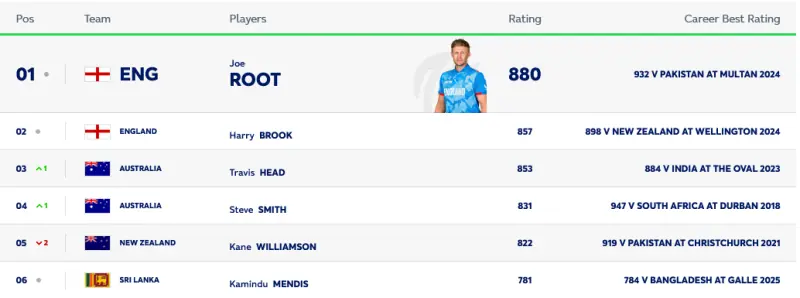 اس کے علاوہ انگلینڈ کے جو روٹ اور ہیری بروک بالترتیب پہلی اور دوسری پوزیشن پر موجود ہیں۔ دیگر ٹیسٹ کھلاڑیوں میں جیکب بیتھل نے 25 درجے ترقی کے بعد 52 ویں پوزیشن حاصل کی جب کہ مائیکل نیسر 7 درجے بہتری کے ساتھ 47 ویں نمبر پر آ گئے ہیں۔ بیو ویبسٹر نے بیٹنگ، بولنگ اور آل راؤنڈر تینوں شعبوں میں اپنی پوزیشن بہتر کی ہے۔