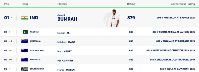 ٹیسٹ بولرز کی فہرست میں بھارت کے جسپریت بمرا پہلی پوزیشن اور پاکستان کے نعمان علی کی ٹیسٹ بولرز رینکنگ میں دوسرا نمبر ہے جب کہ مچل اسٹارک 31 وکٹوں کے ساتھ چھ درجے بہتری کے بعد تیسرے نمبر پر آ گئے ہیں جب کہ اسکاٹ بولینڈ ساتویں پوزیشن پر برقرار ہیں۔ ٹیسٹ آل راؤنڈرز میں بھارت کے رویندرا جڈیجا کا پہلا نمبر برقرار ہے۔