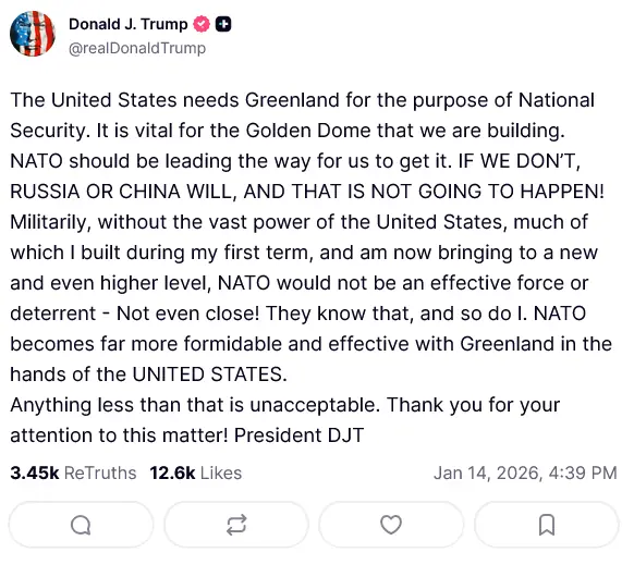 امریکی صدر نے واضح کیا کہ گرین لینڈ کے معاملے میں اس سے کم کسی بھی صورتِ حال کو قابل قبول نہیں سمجھا جائے گا۔