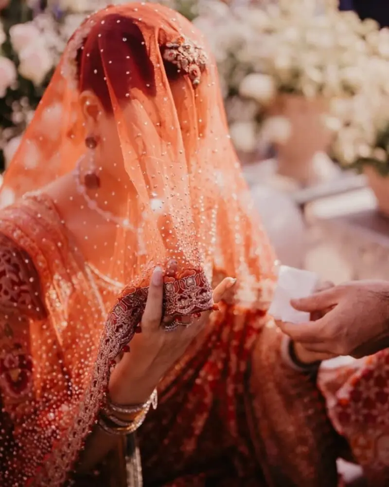انہوں نے بھاری گھونگھٹ، نفیس پولکی ہار جس میں سبز زمرد کے قطرے شامل تھے۔ دلہن نے میک اپ سادہ اور نیوڈ رکھا جبکہ بالوں کو سلیقے سے بن میں باندھا گیا۔