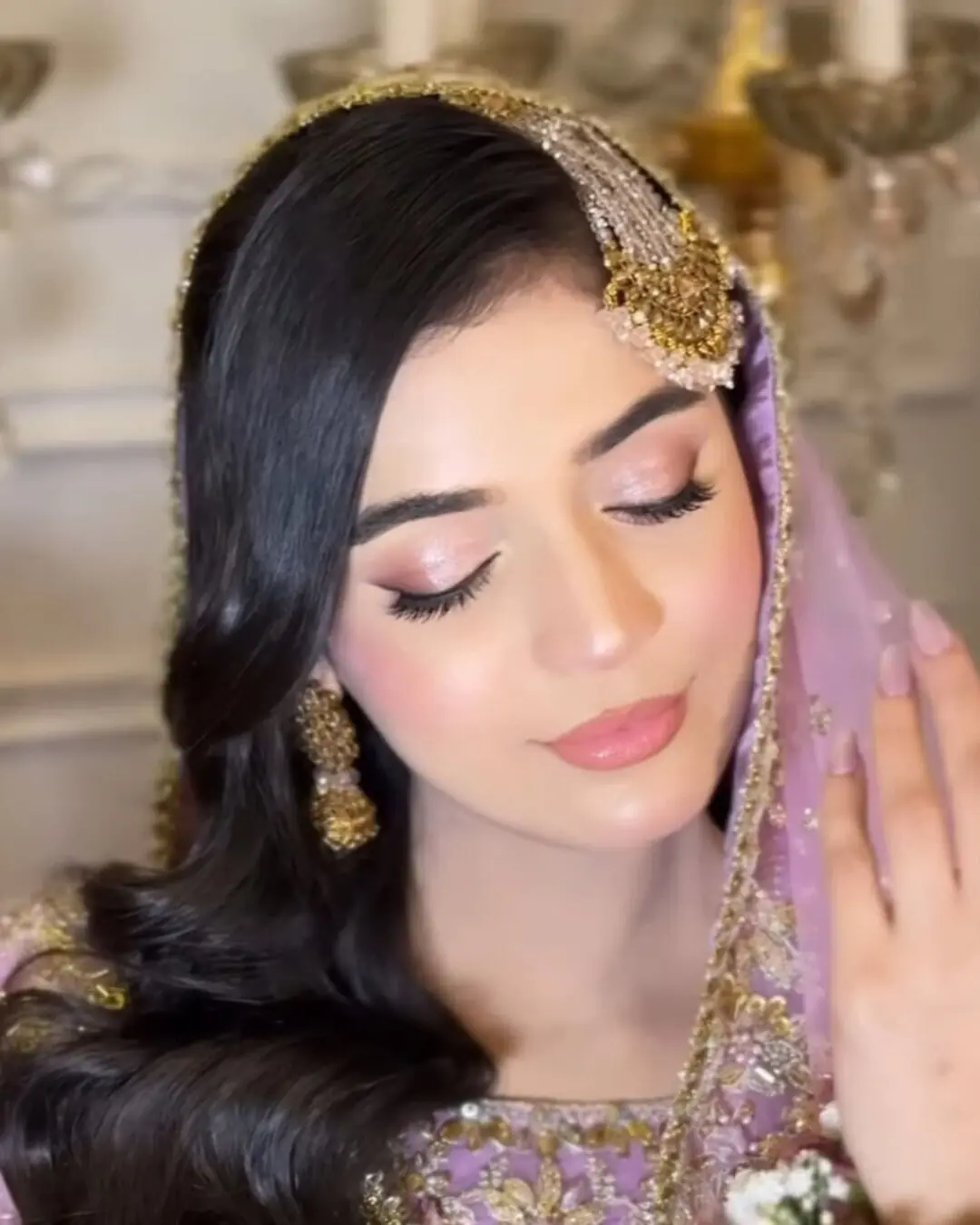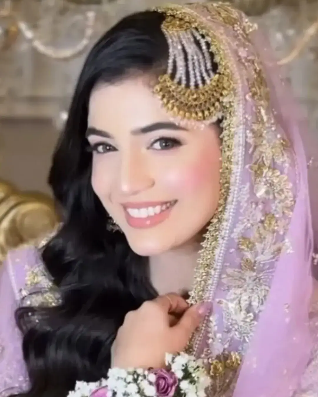 ان کے برائیڈل لک کو گولڈ موتی کا لاکٹ، جھومر اور جھمکے کے ساتھ مکمل کیا گیا، جبکہ بال کھلے اور نرم کرلز میں اسٹائل کیے گئے تھے۔