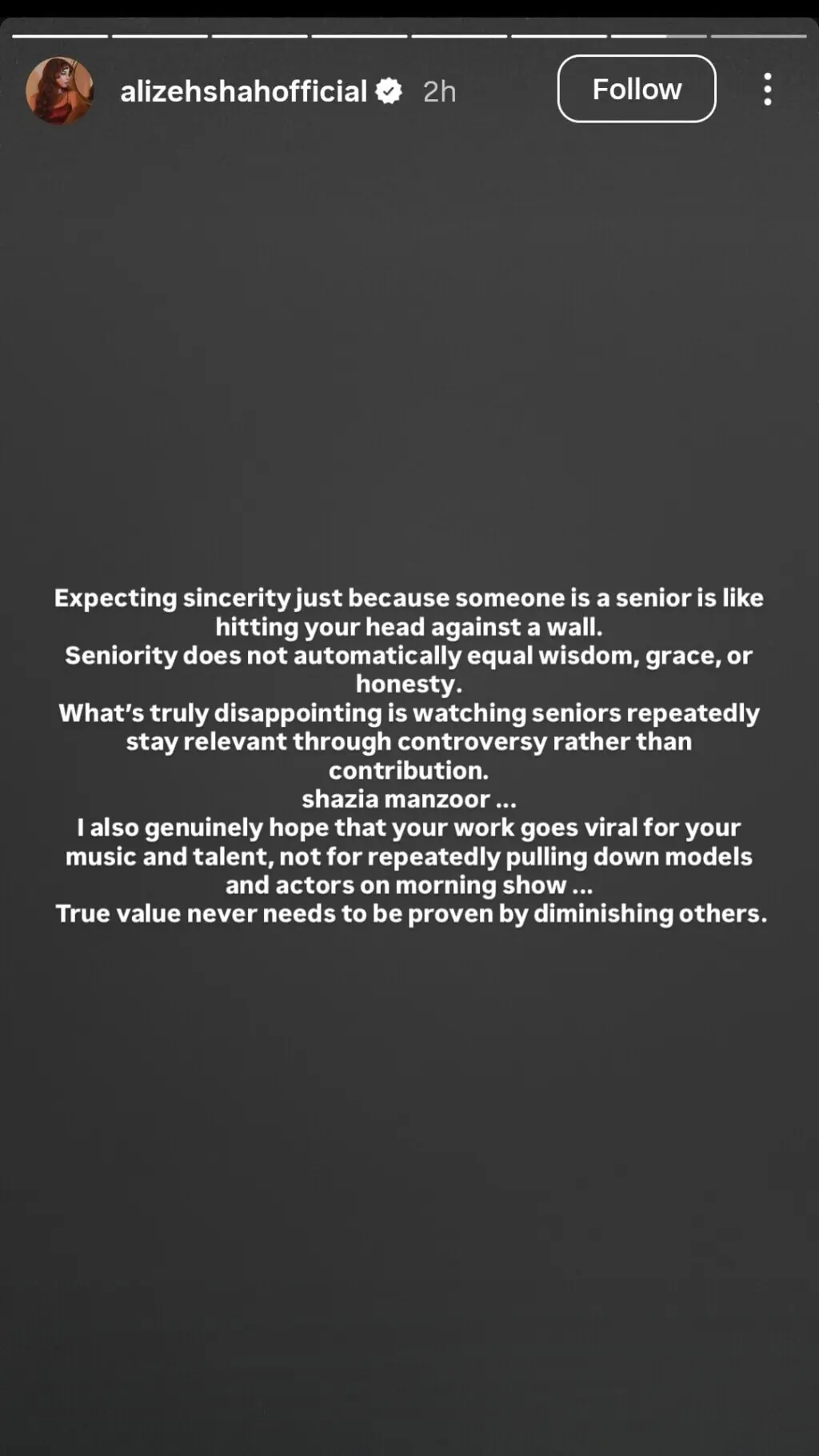 حالیہ دنوں میں شازیہ منظور نے ایک انٹرویو میں اس الزام کی تردید کرتے ہوئے کہا کہ انہوں نے ایسا کچھ نہیں کیا، تاہم علیزے شاہ نے انسٹاگرام پر اس کے جواب میں ایک پیغام شیئر کیا ہے۔