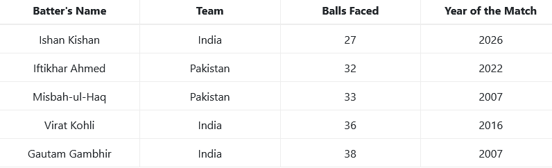 کھیلوں کی ویب سائٹ کرکٹ کرکٹ ایڈکٹر کے مطابق کولمبو کے آر پریماداسا اسٹیڈیم میں کھیلے جارہے میچ میں پاکستان کے خلاف ابتدائی اوور میں ابھیشیک شرما کے صفر پر آؤٹ ہونے کے بعد ایشان کشن نے ذمہ داری سنبھالی اور جارحانہ انداز اپنایا۔ 15 فروری کو ہونے والے اس مقابلے میں بھارتی وکٹ کیپر بلے باز نے صرف 27 گیندوں پر نصف سنچری مکمل کی، جو پاک بھارت میچوں کی تاریخ کی تیز ترین ففٹی ہے۔