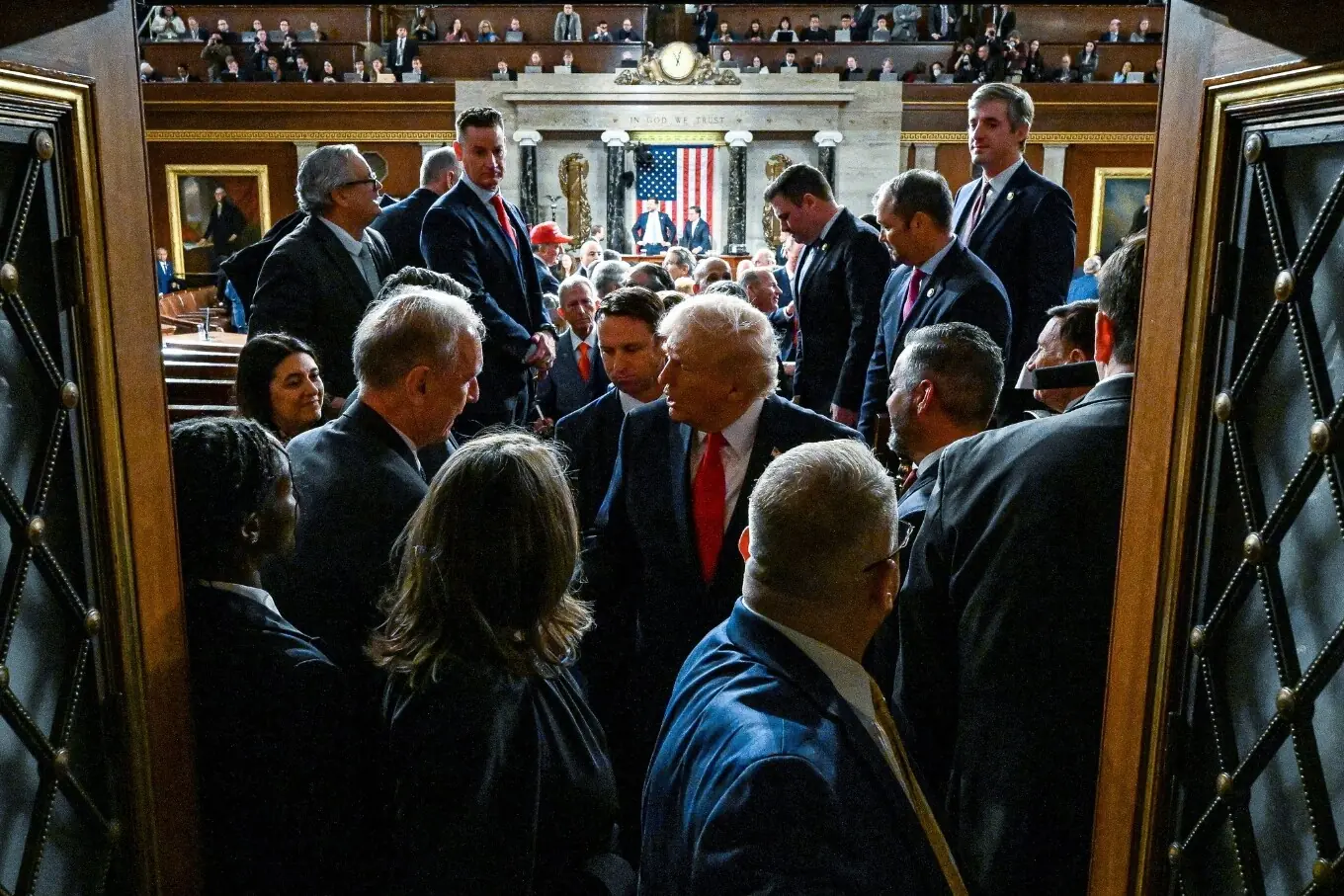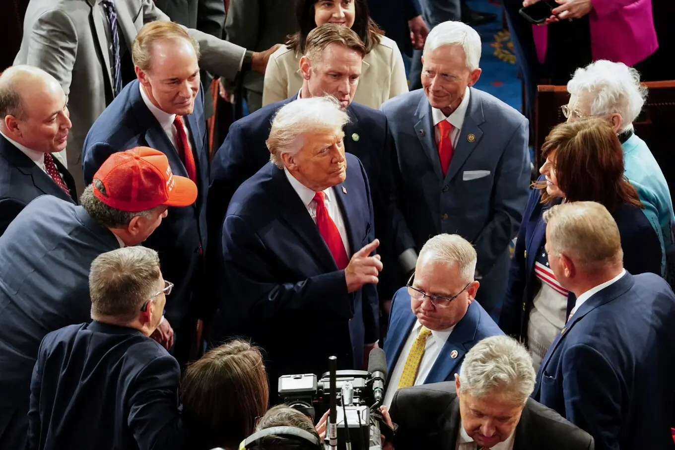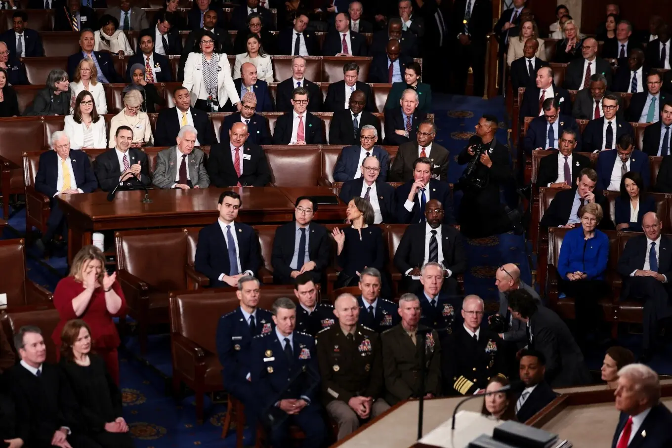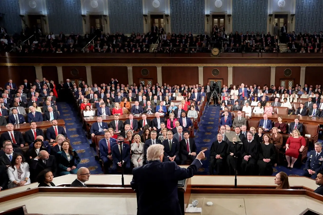 امریکی صدر ڈونلڈ ٹرمپ نے واشنگٹن ڈی سی کی کیپیٹل بلڈنگ میں 24 فروری 2026 کو اپنے دوسرے دورِ صدارت کا پہلا سالانہ یعنی ’اسٹیٹ آف دی یونین‘ خطاب کیا۔ اس تقریب میں اہم شخصیات جیسے نائب صدر، اسپیکر آف دی ہاؤس، سپریم کورٹ کے ججز، کابینہ ارکان اور اولمپک ہاکی ٹیم، خلا باز اور اپسٹین متاثرین کے ارکان شامل تھے۔ ہال کا ماحول پرجوش اور متوازن تھا۔ ریپبلکن اراکین کی تالیاں اور ڈیموکریٹس کی خاموش تنقید کے بیچ ٹرمپ نے معاشی بحالی، سرحدی تحفظ اور ایگزیکٹو آرڈرز پر زور دیتے ہوئے تقریر کی، جو مڈ ٹرم الیکشن سے قبل ووٹرز کو متحد کرنے کی کوشش تھی۔ رائٹرز نے تصاویر کے ذریعے صدر ٹرمپ کے اسٹیٹ آف دی یونین خطاب، کانگریس کے ردعمل اور ہال کے مناظر کو مؤثر انداز میں پیش کیا۔
