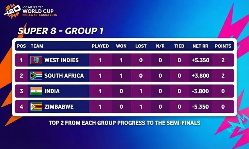 ٹی 20 ورلڈ کپ 2026 کے سپر ایٹ مرحلے کے گروپ وَن میں ویسٹ انڈیز کی پوزیشن فی الحال سب سے زیادہ مستحکم ہے۔ ویسٹ انڈیز اس وقت 2 پوائنٹس اور انتہائی مضبوط نیٹ رن ریٹ کے ساتھ گروپ میں سرِفہرست ہے۔