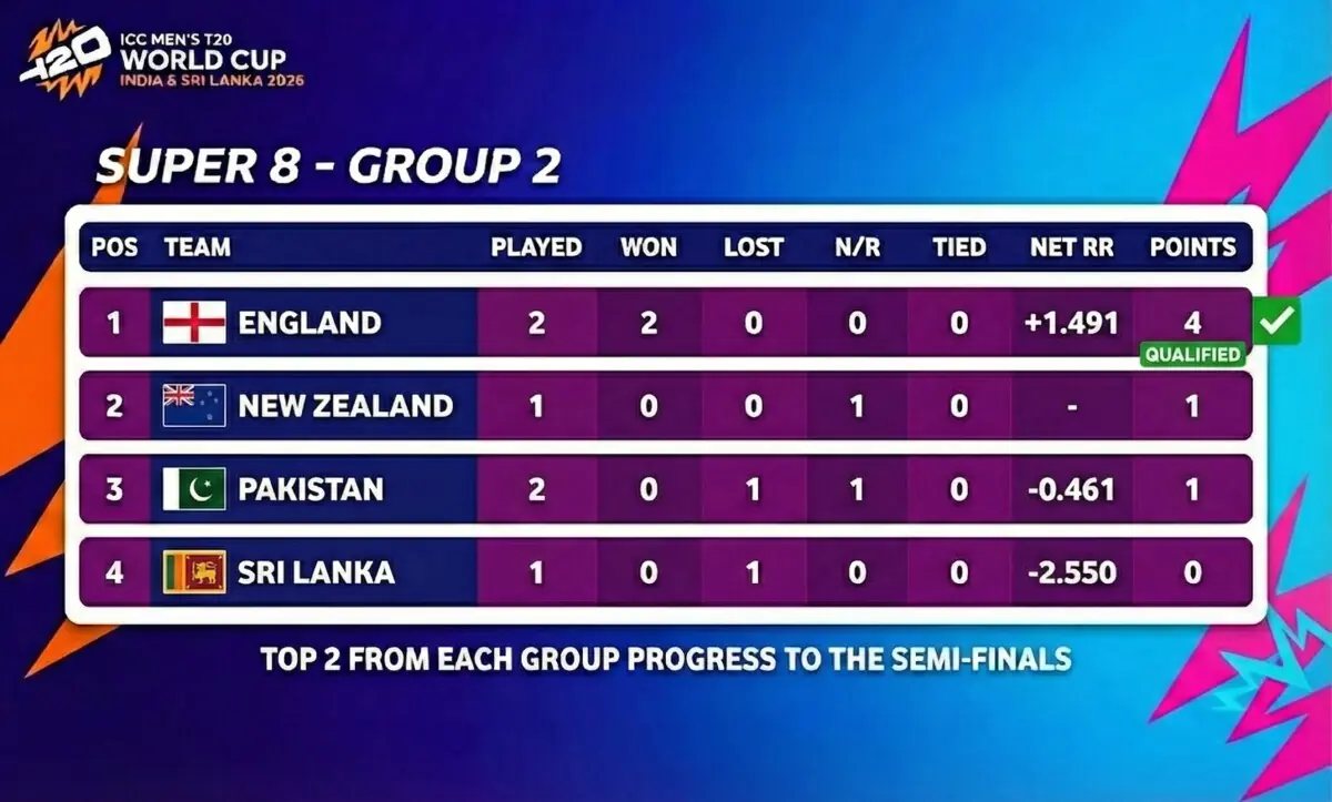 سپر 8 مرحلے کے گروپ ٹو میں انگلینڈ سیمی فائنل کے لیے کوالیفائی کرنے والی پہلی ٹیم بن چکی ہے۔ جب کہ دوسری سیمی فائنلسٹ ٹیم کے لیے پاکستان، نیوزی لینڈ اور سری لنکا کے درمیان کانٹے کا مقابلہ جاری ہے۔