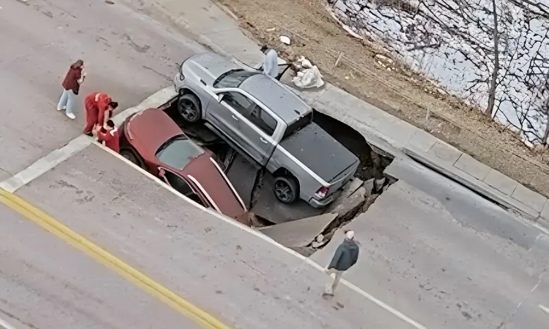 امریکا: مصروف شاہراہ پر سڑک دھنسنے سے 2 گاڑیاں گڑھے میں جاگریں، ویڈیو وائرل