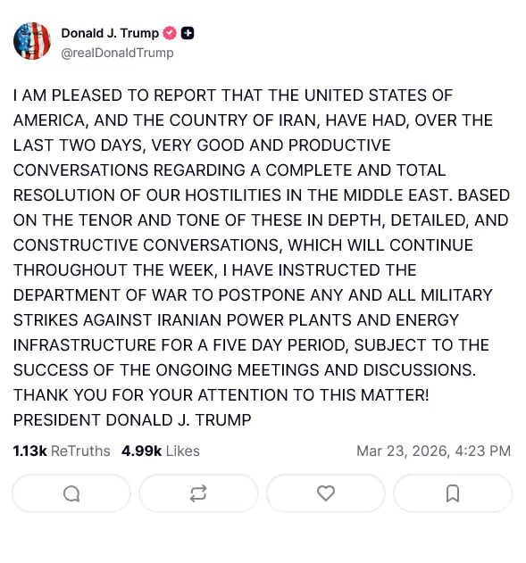 امریکی صدر ڈونلڈ ٹرمپ نے ایران کے پاور پلانٹس پر حملے 5 روز کے لیے ملتوی کرنے کا حکم دیتے ہوئے کہا ہے کہ ایران کے ساتھ ہونے والی بات چیت مثبت اور نتیجہ خیز رہی۔