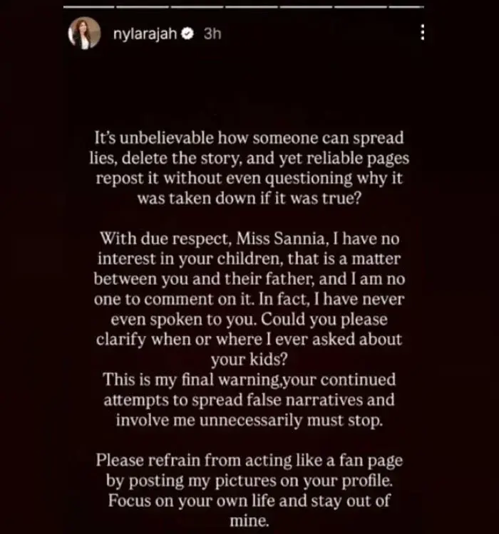 نائلہ راجہ نے اپنے بیان میں کہا کہ ’مجھے آپ کے بچوں میں کوئی دلچسپی نہیں ہے، یہ معاملہ صرف آپ اور ان کے والد کے درمیان ہے اور میں اس پر کوئی تبصرہ کرنے والی نہیں ہوں‘۔