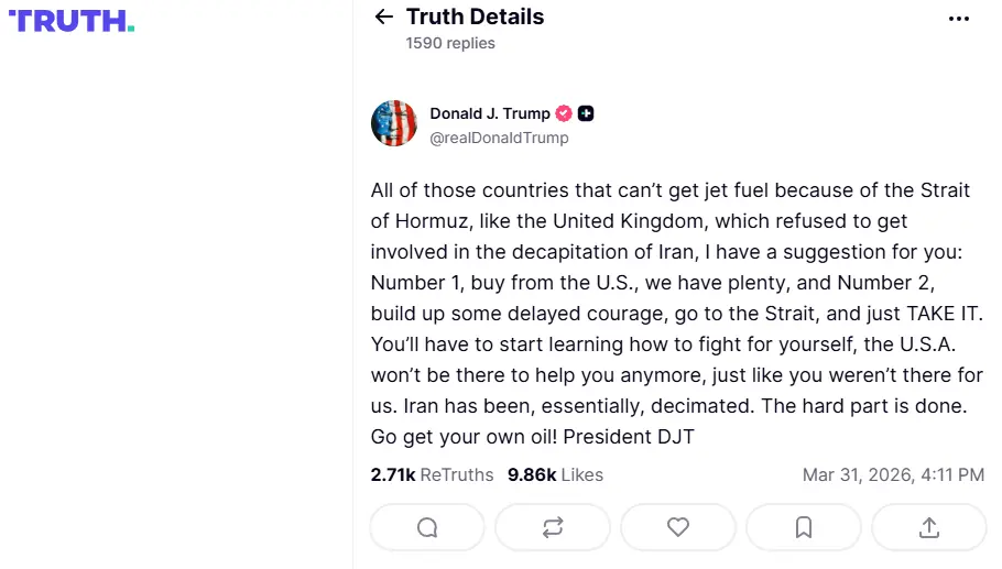 صدر ٹرمپ نے اپنے سوشل پلیٹ فارم ’ٹروتھ سوشل‘ پر ایک بیان میں کہا ہے کہ وہ ممالک جو آبنائے ہرمز کی موجودہ کشیدہ صورت حال کی وجہ سے جیٹ فیول حاصل نہیں کر پا رہے، جیسے برطانیہ، انہیں چاہیے کہ وہ یا تو امریکا سے تیل خریدیں یا خود اس خطے میں جا کر اپنے مفادات اور توانائی ضروریات کا تحفظ کریں۔