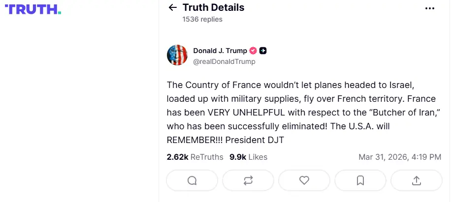امریکی صدر نے اپنے سوشل پلیٹ فارم پر فرانس پر بھی تنقید کی، انھوں نے کہا کہ فرانس نے اسرائیل کے لیے فوجی ساز و سامان لے جانے والے طیاروں کو اپنی فضائی حدود سے گزرنے کی اجازت نہیں دی، فرانس ایرانی قصاب کے معاملے میں غیر مددگار ثابت رہا۔