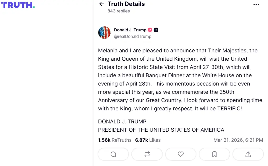 دوسری جانب صدر ٹرمپ نے اپنے سوشل اکاؤنٹ ’ٹروتھ سوشل‘ پر بیان جاری کیا جس میں انھوں نے کہا کہ میری اور ملانیہ کی خوشی ہے کہ ان کے اعلیٰ مرتبہ، برطانیہ کے بادشاہ اور ملکہ، اپریل 27 تا 30 کو امریکا کا تاریخی ریاستی دورہ کریں گے، جس میں 28 اپریل کی شام وائٹ ہاؤس میں ایک شاندار ضیافت بھی شامل ہے۔