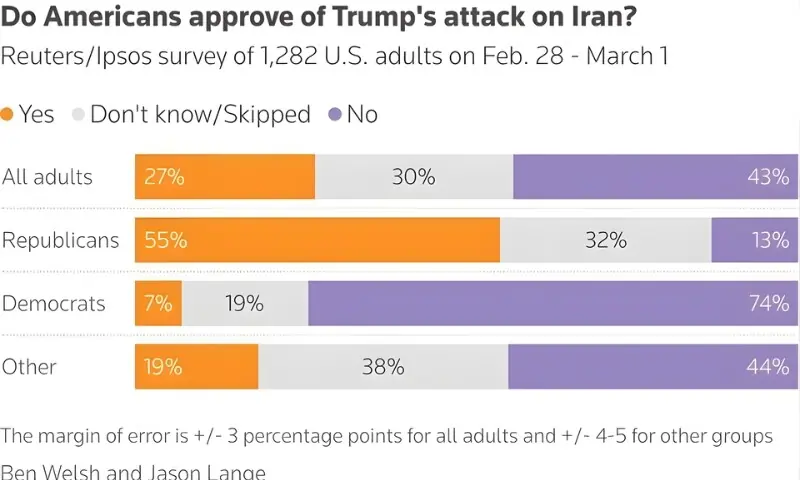 برطانوی خبر رساں ایجنسی ’رائٹرز‘ اور اپسوس کے تازہ ترین سروے کے مطابق امریکیوں کی اکثریت اس جنگ کو اپنے ملک اور مشرقِ وسطیٰ کے لیے نقصان دہ قرار دے رہی ہے۔